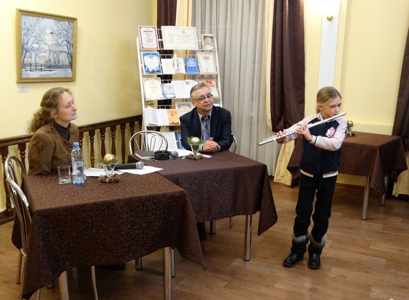 Ведущие салона подготовили вопросы, на которые искренне и с улыбкой отвечала Инна. Прозвучали музыкальные подарки в исполнении сотрудницы библиотеки Натальи Шемет, волшебно играла на флейте дочь Инны Спасибиной – Яся. Настоящим украшением вечера стало выступление Алексея Дроздова, ученика 6 класса (педагог Чепик Ольга Григорьевна), лауреата международных и региональных конкурсов, который виртуозно исполнил на фортепиано этюды Яна Сибелиуса и Болеса Дворионоса.