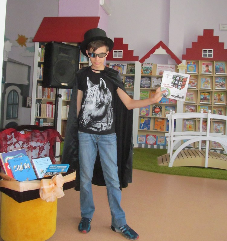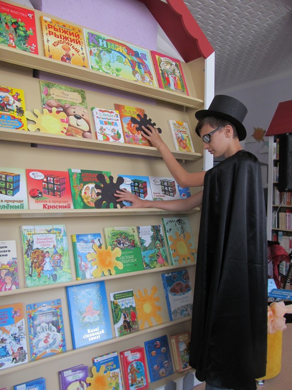 13 июня для юных читателей состоялась презентация необычной выставки «Книжная радуга».В ее открытии приняли участие ребята из школьных лагерей СШ № 5 и 67. Не успели гости познакомиться с книгами, как явился таинственный незнакомец и похитил все экспонаты выставки (книги с “цветными названиями”), заменив их черными кляксами. Непрошеным гостем оказался коварный и зловредный Кляксич со сказочных страниц И. Токмаковой.
