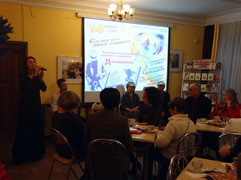 Этот вечер прошел по-особому празднично, чему способствовали романтическое оформление кафе и удивительные вокальные и инструментальные номера – музыкальные истории любви. Звездную атмосферу создали профессиональные исполнители: певица Элеонора Ходырева, восхитившая проникновенным, чутким исполнением романсов и музыкант Александр Семашко, в творческом багаже которого двухчасовой сольный саксофонный концерт. Гости вечера услышали удивительные, самые красивые истории любви знаменитых писателей, художников, артистов. Иллюстрациями стали красочные портреты и малоизвестные фотографии на экране.