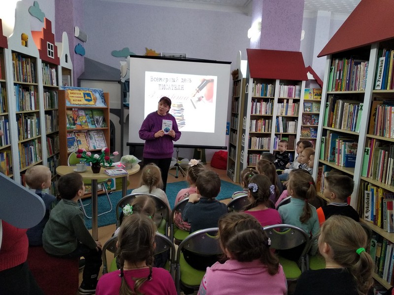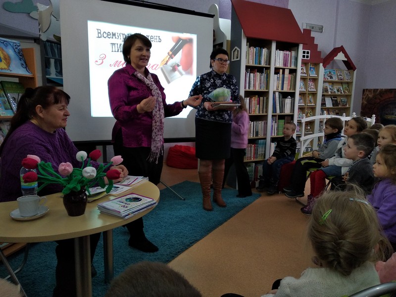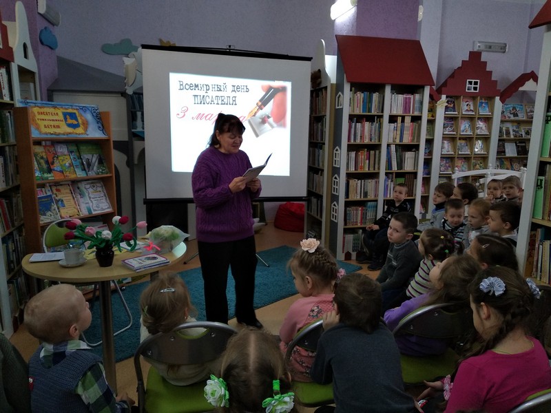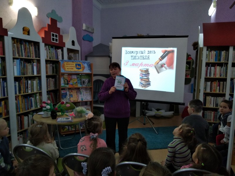 Накануне Всемирного дня писателя, который вся страна отмечала 3 марта, в отделе обслуживания учащихся 1-5 классов состоялась литературная гостиная с гомельской писательницей Татьяной Михайловной Чекед. Гостями праздничной встречи стали юные воспитанники ГУО «Ясли-сад №71». Ребята пришли не просто так, они заранее познакомились с творчеством Татьяны Чекед по книгам «100 загадок для ребят» и «Квак – математик». Писательница читала стихи, сказки, загадывала загадки, рассказывала о журналах «Мир животных», «Вясёлка», «Буся» и других изданиях, где были опубликованы ее детские произведения. Юные читатели рассуждали о том, кого называют писателями, перечисляли уже известных детских классиков литературы и внимательно слушали автора. В конце встречи Татьяна Михайловна подарила в отдел 2 книги «Петушок клевал снежок» и «Вясёлы аўтобус», которые пополнят копилку книг с подписью автора.