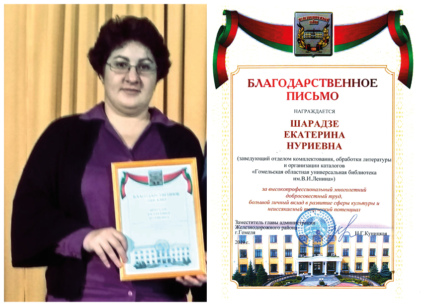 - Екатерина Нуриевна Шарадзе, заведующая отделом комплектования, обработки литературы и организации каталогов, отмечена Благодарственным письмом администрации Железнодорожного района г. Гомеля за высокопрофессиональный многолетний добросовестный труд, большой личный вклад в развитие сферы культуры и неиссякаемый творческий потенциал.