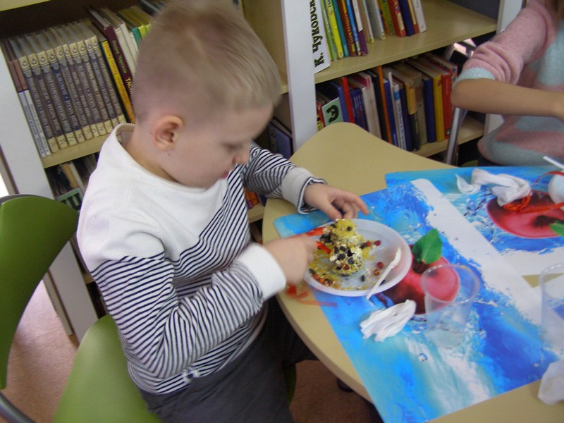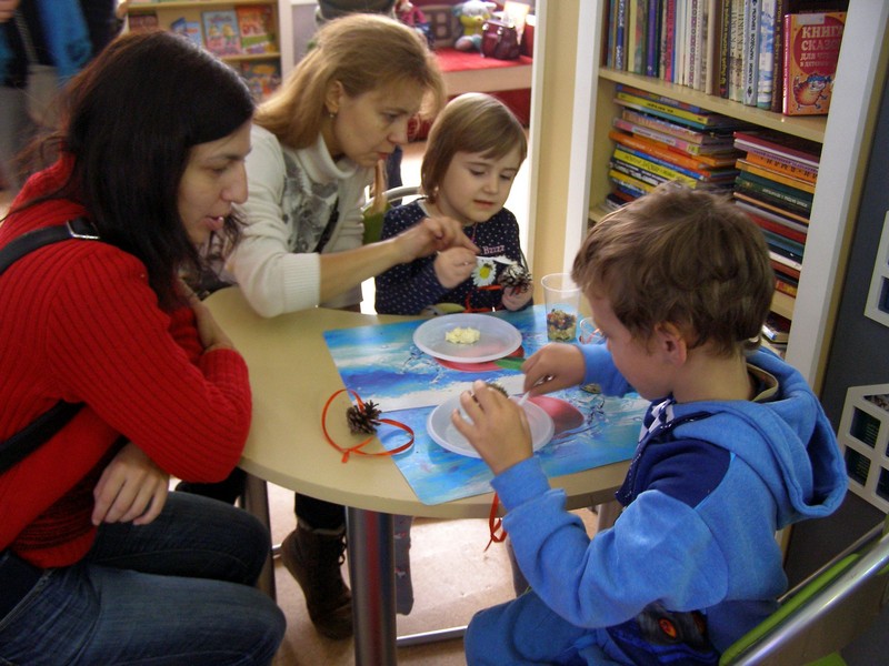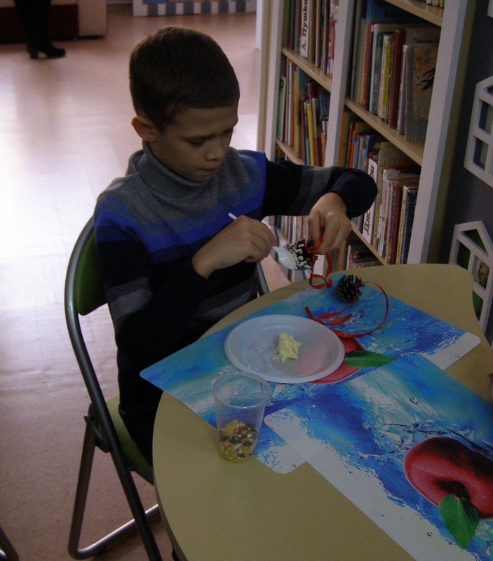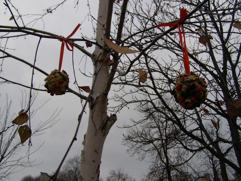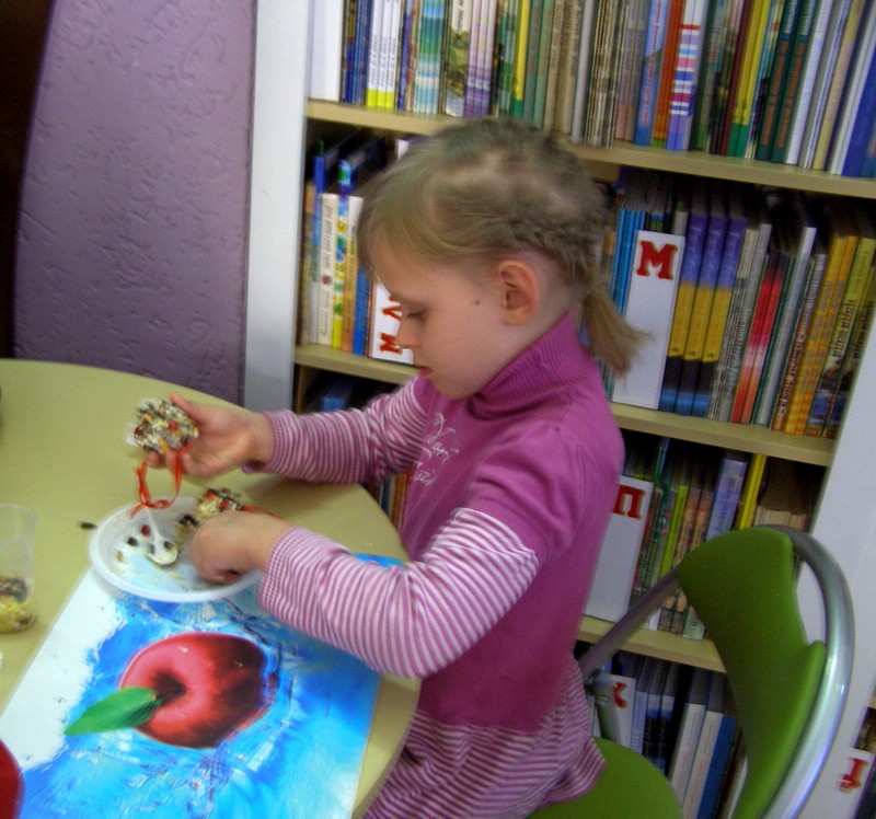 На мастер-классе девчонки и мальчишки очень старались, делая для птичек необычную кормушку. Для этого им понадобилась сосновая шишка, ленточка, сливочное масло, пшённая крупа, овсяные хлопья, гречка, семечки подсолнуха и тыквенные, грецкие орехи, печенье, калина, рябина, виноград. Немного времени и усилий – и необычный обед для пернатых друзей готов!