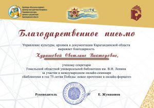В год 75-летия Победы в Великой Отечественной войне 1941–1945 гг. 17 ноября Карагандинская областная универсальная научная библиотека им. Н. В. Гоголя провела Международный практический онлайн-семинар «Библиотеки в год 75-летия Победы: новое прочтение в онлайн-формате». Цель вебинара – обмен положительным опытом библиотек по подготовке и проведению мероприятий к 75-летию Победы в период пандемии, развитие международного и межрегионального библиотечного сотрудничества.