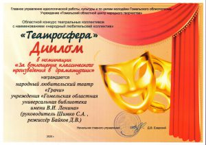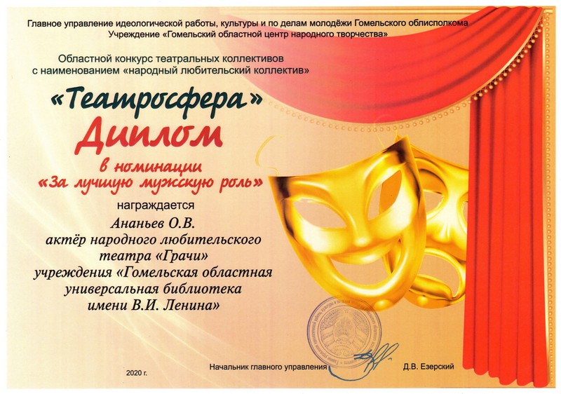 В ноябре 2020 года состоялся областной конкурс театральных коллективов со званием «народный любительский коллектив» «Театросфера», в котором приняли участие 14 коллективов из города Гомеля и 10 районов области. Решением компетентного жюри актёр театра Олег Валентинович Ананьев награждён дипломом и ценным призом за лучшую мужскую роль (Лепорелло); дипломом и ценным призом отмечен народный любительский театр «Грачи» в номинации «За воплощение классического произведения в драматургии».