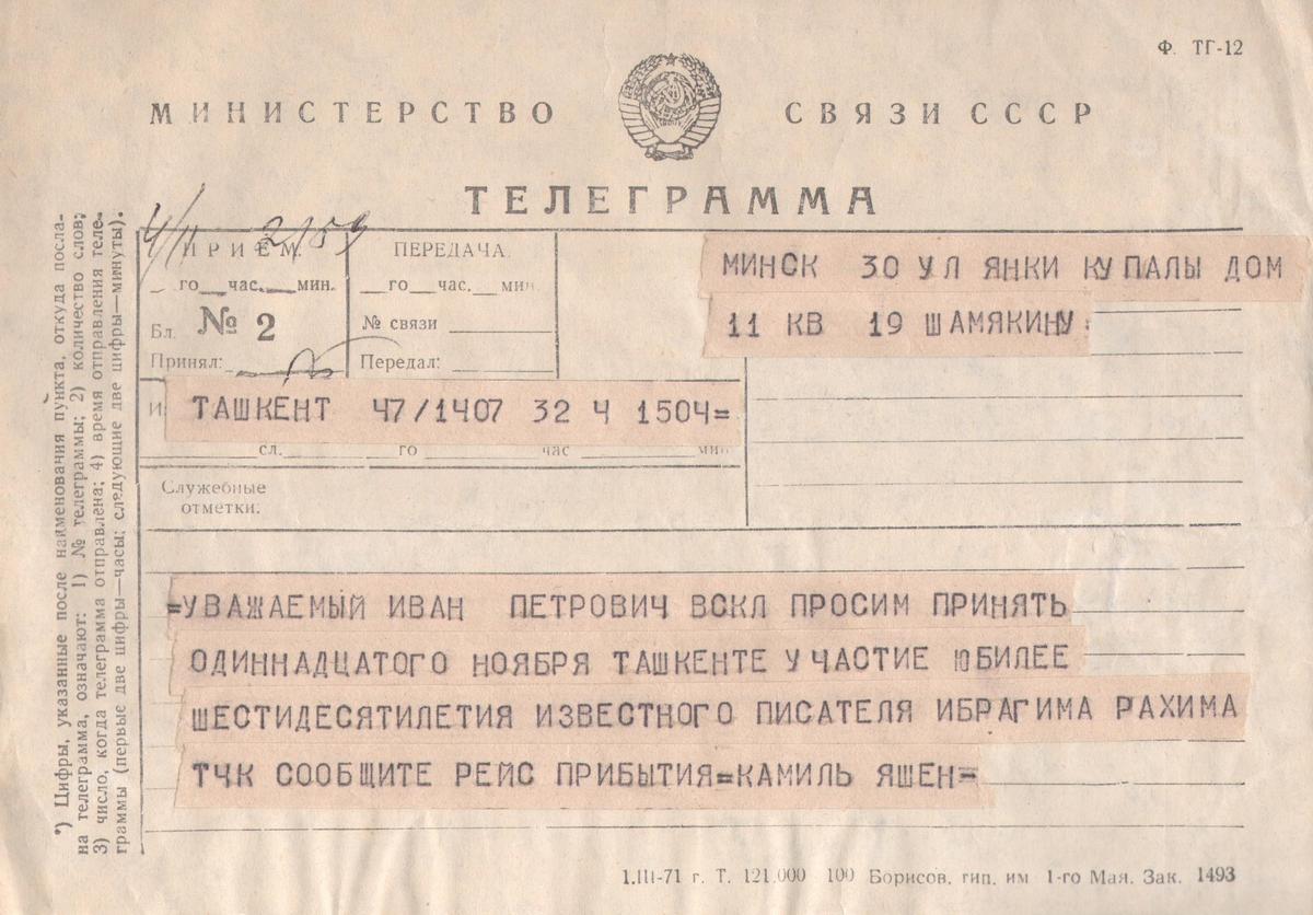 У фондах музея захоўваюцца асабістыя рэчы пісьменнікаў, якія, напэўна, памятаюць і саміх творцаў, і той час. Тэлеграма ад 4 лістапада 1976 года таму сцвярджэнне. Іван Пятровіч Шамякін быў актыўным грамадскім дзеячам. На гэты раз яго запрашалі прыняць удзел у святкаванні юбілею Ібрагіма Абдурахімавіча Рахімава, савецкага ўзбекскага пісьменніка, сцэнарыста, драматурга.