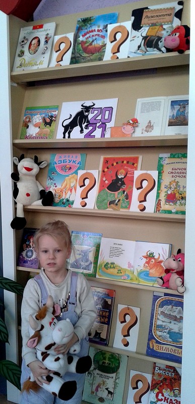 Юных читателей ждут встречи с книгами С. Баруздина «Вежливый бычок», Д. Варденбург «Фаня, Апельсин и четверо из города», Б. Заходера «Про летающую корову», М. Липскерова «Как волк телёночку мамой был», Г. Цыферова «Телёнок», К. Ушинского «Коровка», Ю. Висландер «Мама Му», А. Штеффенсмайера «Лизелотта», Д. Биссета «Эннабель» и многими другими замечательными историями. А побольше узнать о символе года как о животном, помогут познавательные энциклопедии, которые ответят на все ваши почеМУ-У-У!