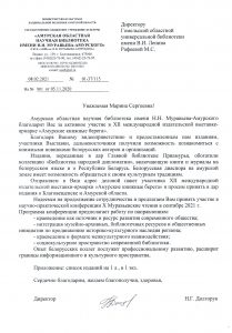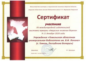 В декабре 2020 года Гомельская областная библиотека приняла участие в XII международной издательской выставке-ярмарке «Амурские книжные берега» (Благовещенск, 9–11 декабря, 2020) по приглашению Амурской областной научной библиотеки имени Н. Н. Муравьёва-Амурского. Директором библиотеки – Мариной Сергеевной Рафеевой – было направлено приветственное видеообращение участникам мероприятия. Для выставки-ярмарки были отправлены книги гомельчан – членов Союза писателей Беларуси В. Гавриловича, Н. Шеметковой, а также иллюстрированный каталог «Пережившие века», подготовленный сотрудниками Гомельской областной библиотеки под руководством и самом непосредственном участии директора М. С. Рафеевой и изданный редакцией газеты «Гомельская праўда».