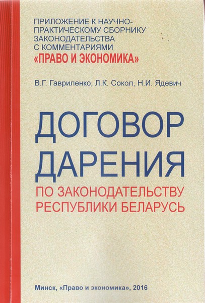 Гавриленко, В. Г. Договор дарения по законодательству Республики Беларусь / В. Г. Гавриленко, Л. К. Сокол, Н. И. Ядевич. – Минск : Право и экономика, 2016. – 183, [1] с. – (Приложение к научно-практическому сборнику законодательства с комментариями “Право и экономика”).