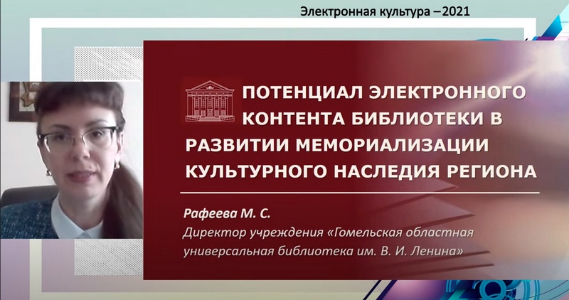Марина Сергеевна представила доклад «Потенциал электронного контента библиотеки в развитии мемориализации культурного наследия региона». На примере работы Гомельской областной библиотеки убедительно показано, что электронный информационный контент библиотеки, как уникального фондодержателя всей многоотраслевой информации, связанной с краем, даёт возможность детально зафиксировать отдельные важные для сохранения культурного наследия проживающих на данной территории людей явления и объекты, открыть широкий доступ к ним в интернет-пространстве.