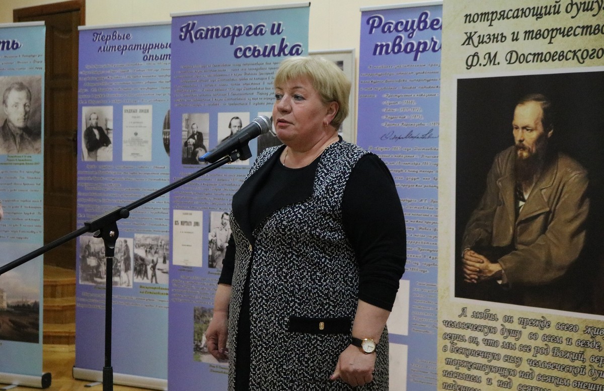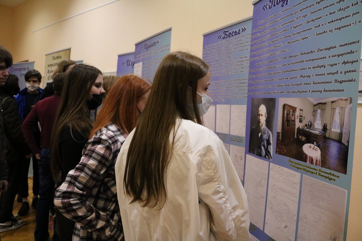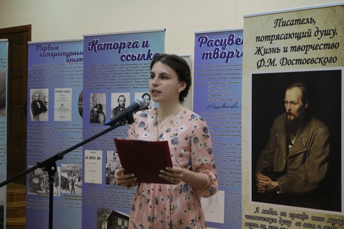 Иллюстрируя самые важные даты и значимые события из жизни писателя, мыслителя, публициста, выставочный проект раскрывает нравственные идеалы и мировоззрение Достоевского. Материалы знакомят с воспоминаниями современников, дневниковыми записями, фотографиями. Дополняют экспозицию рисунки персонажей романов и «готические наброски», выполненные рукой гениального классика русской литературы. Детально и содержательно выставку представил аудитории кандидат филологических наук, доцент кафедры русского, общего и славянского языкознания Гомельского государственного университета имени Франциска Скорины Артём Леонидович Стрижак.