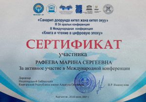 Директор Гомельской областной библиотеки Марина Сергеевна Рафеева приняла участие в II Международной научно-практической конференции «Книга и чтение в цифровую эпоху», которая состоялась 20–23 июня в Кыргызстане. В работе конференции приняли участие директора крупнейших библиотек из Азербайджана, Армении, Беларуси, Казахстана, Кыргызстана, Молдовы, России, Таджикистана, Узбекистана, Украины, руководители министерств и ведомств республики, учёные, специалисты научно-исследовательских и образовательных учреждений, а также издательств стран СНГ.