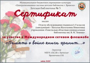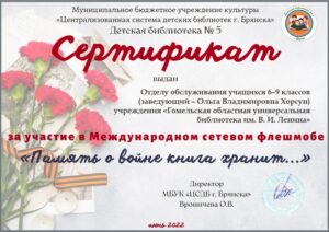Сотрудники отделов обслуживания учащихся 1–5 и 6–9 классов приняли участие в Международном сетевом флешмобе «Память о войне книга хранит…», инициированном Детской библиотекой № 5 МБУК «Централизованная система детских библиотек г. Брянска» и посвящённом 81-й годовщине начала Великой Отечественной войны.