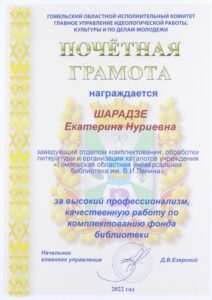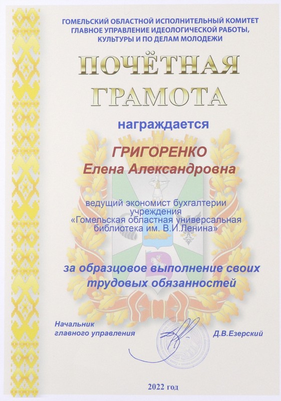 Почётными грамотами главного управления идеологической работы, культуры и по делам молодёжи награждены заведующий отделом комплектования, обработки и организации каталогов Екатерина Шарадзе за высокий профессионализм, качественную работу по комплектованию фонда библиотеки и ведущий экономист бухгалтерии Елена Григоренко за образцовое выполнение своих трудовых обязанностей.