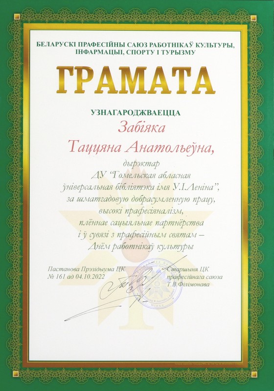 Директор Гомельской областной библиотеки Татьяна Забияко за многолетнюю добросовестную работу, высокий профессионализм, плодотворное социальное партнёрство и в связи с профессиональным праздником награждена Грамотой Центрального комитета Белорусского профессионального союза работников культуры, информации, спорта и туризма.
