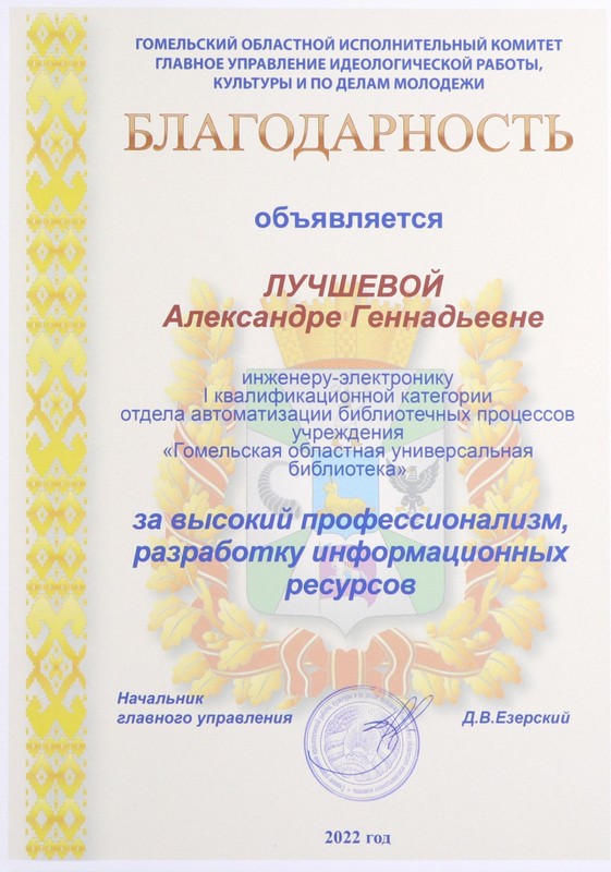Благодарность главного управления идеологической работы, культуры и по делам молодёжи за высокий профессионализм, разработку информационных ресурсов объявлена Александре Лучшевой, инженеру электронику 1 кв. категории отдела автоматизации библиотечных процессов.