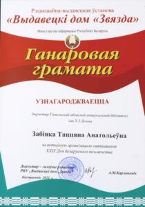 В праздничные октябрьские дни заслуженную награду в крупнейшую библиотеку региона привёз главный редактор Издательского дома «Звязда» Александр Карлюкевич – директор Гомельской областной библиотеки Татьяна Забияко награждена Почётной грамотой за активную организацию празднования XXIX Дня белорусской письменности, который прошёл 3–4 сентября этого года в г. Добруше при энергичном участии библиотек Гомельщины.