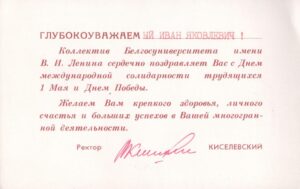 Почтовая открытка – это своеобразная визитка времени. Сегодняшнему поколению трудно понять, почему небольшой кусок цветного картона с поздравительными словами доставлял много радости. Ещё труднее поверить, что 40-50 лет назад открытка могла быть единственным праздничным подарком, которым обменивались родственники и друзья. Открытки продавались не только в почтовых отделениях, но и в книжных магазинах, а позже – в киосках, где торговали газетами и журналами. Конечно, открытки были чем-то большим, чем обычное поздравление к праздникам. В них отражалась история страны, события того или иного периода жизни человека, которому она была адресована. Например, открытка с праздником 1 Мая, адресованная народному писателю БССР Ивану Науменко, рассказывает нам о том, что с Первомайскими праздниками от имени коллектива Белгосуниверситета имени В. И. Ленина Ивана Яковлевича поздравил ректор БГУ (1983–1990) Леонид Иванович Киселевский.