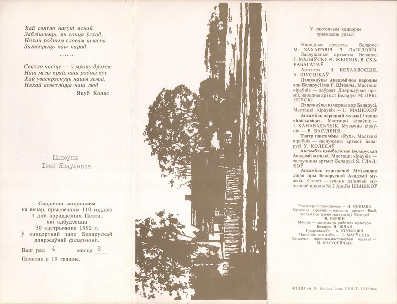 У 1992 г. уся грамадскасць нашай краіны адзначала 110-годдзе з дня нараджэння беларускага пісьменніка, драматурга, паэта і перакладчыка, грамадскага дзеяча, аднаго з заснавальнікаў новай беларускай літаратуры народнага паэта БССР Якуба Коласа. 30 кастрычніка 1992 г. у канцэртнай зале Беларускай дзяржаўнай філармоніі адбыўся вечар, прысвечаны знакмітаму пісьменніку. У святочным вечары прымалі ўдзел народныя артысты Беларусі М. Захарэвіч, Л. Давідовіч, заслужаныя артысты Беларусі Г. Маляўскі, М. Жылюк, В. Скарабагатаў, дзяржаўны акадэмічны народны хор Беларусі імя Г. Цітовіча і інш. Сярод гасцей быў і наш зямляк, народны пісьменнік Беларусі Іван Якаўлевіч Навуменка. Аб чым сведчыць запрашальны білет на вечарыну, які захоўваецца ў Літаратурным музеі пісьменнікаў Гомельшчыны. Білет падараваў бібліятэцы сын пісьменніка Павел Іванавіч Навуменка.