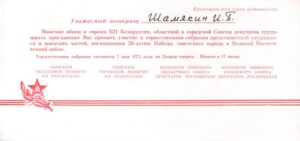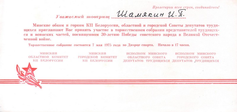 Іван Пятровіч Шамякін вёў актыўную грамадскую дзейнасць. Ён неаднаразова выбіраўся дэпутатам у Вярхоўны Савет БССР (1963–1985). З 1971 па 1985 г. быў Старшынёй Вярхоўнага Савета БССР. Архіў пісьменніка, які захоўваецца ў Літаратурным музеі пісьменнікаў Гомельшчыны, утрымлівае цікавы экспанат – «Запрашэнне» на ўрачысты сход, прысвечаны 30-годдзю Перамогі савецкага народа ў Вялікай Айчыннай вайне. Сход праходзіў 7 мая 1975 г. у Дварцы спорту. Запрашэнне падаравана дачкой пісьменніка Алесяй Іванаўнай.