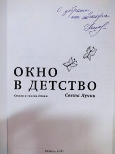 Главный редактор прекрасных журналов «Мир животных», «Метаморфозы» и «Эколог и я» Наталья Сляднева вручала дипломы за активное участие гомельчан в литературной жизни этих изданий. Получила диплом и библиотекарь Валентина Лукьянова за активное сотрудничество и популяризацию любви к живой природе. А вот библиотеке Буратино достался подарок в виде книги! Светлана Лосева, член Российского союза писателей, давний друг журналов и библиотеки, передала в дар свою книгу «Окно в детство». Прекрасные детские стихи рязанской поэтессы уже несколько лет согревают детские сердца юных гомельских читателей, поскольку Светлана Петровна несколько раз сама лично была на встречах в библиотеке, встречалась с юными ребятами, оставляла книги в дар для читателей отдела.