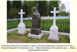 В 60–х годах XIX в. драматург вместе со своим братом Михаилом Николаевичем купил у мачехи Щелыково. Но литератор приезжал в эту замечательную усадьбу в Костромской губернии скорее для работы, чем для отдыха. В 1881 г. он писал из Щелыкова писателю Н. Я. Соловьёву: «Работаю я непрерывно и много и не только конца работы, но даже не вижу впереди и возможности отдохнуть хоть немного». Пошатнувшееся от усиленной работы здоровье подвело драматурга, и 14 июня (2 июня) 1886 г. Александр Николаевич Островский скончался.