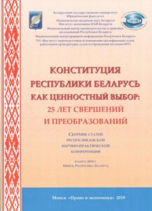 Конституция Республики Беларусь как ценностный выбор: 25 лет свершений и преобразований : сборник статей Республиканской научно-практической конференции, 4 марта 2019 г., Минск, Республика Беларусь / [редколлегия: Г. А. Василевич (главный редактор) и др.]. – Минск : Право и экономика, 2019. – 466 с.