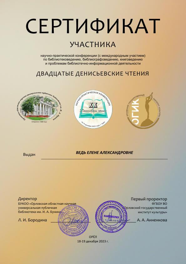19 декабря библиотекарь отдела хранения основного фонда Елена Ведь с видеодокладом «Организация и становление архива Гомельской областной универсальной библиотеки им. В. И. Ленина» приняла участие в Двадцатых Денисьевских чтениях – научно-практической конференции (с международным участием), носящей имя видного библиотековеда, уроженца г. Орла В. Н. Денисьева.