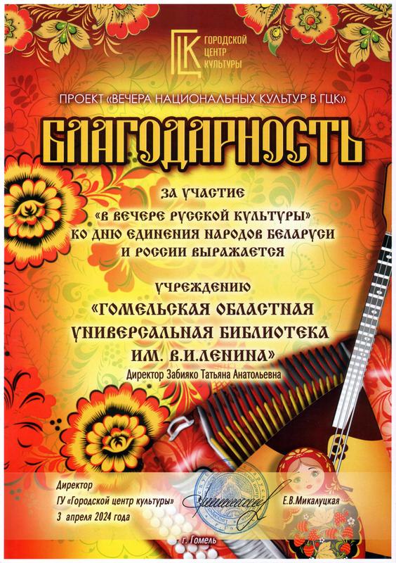 Гомельская областная библиотека приняла участие в культурно-досуговом мероприятии с участием творческих коллективов из Гомельской и Брянской областей «Вечер русской культуры», приуроченном ко Дню единения народов Беларуси и России.