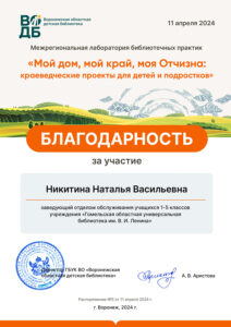 Заведующий отделом обслуживания учащихся 1–5 классов Наталья Никитина 11 апреля приняла участие в межрегиональной лаборатории библиотечных практик «Мой дом, мой край, моя Отчизна: краеведческие проекты для детей и подростков», инициированной Воронежской областной детской библиотекой.