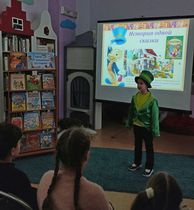 Юных читателей встретил Мудрый Сверчок, который рассказал занимательную историю появления на страницах книг Пиноккио и Буратино. Увлечённо ребята играли в сказочную азбуку, отгадывая персонажей на представленные буквы.