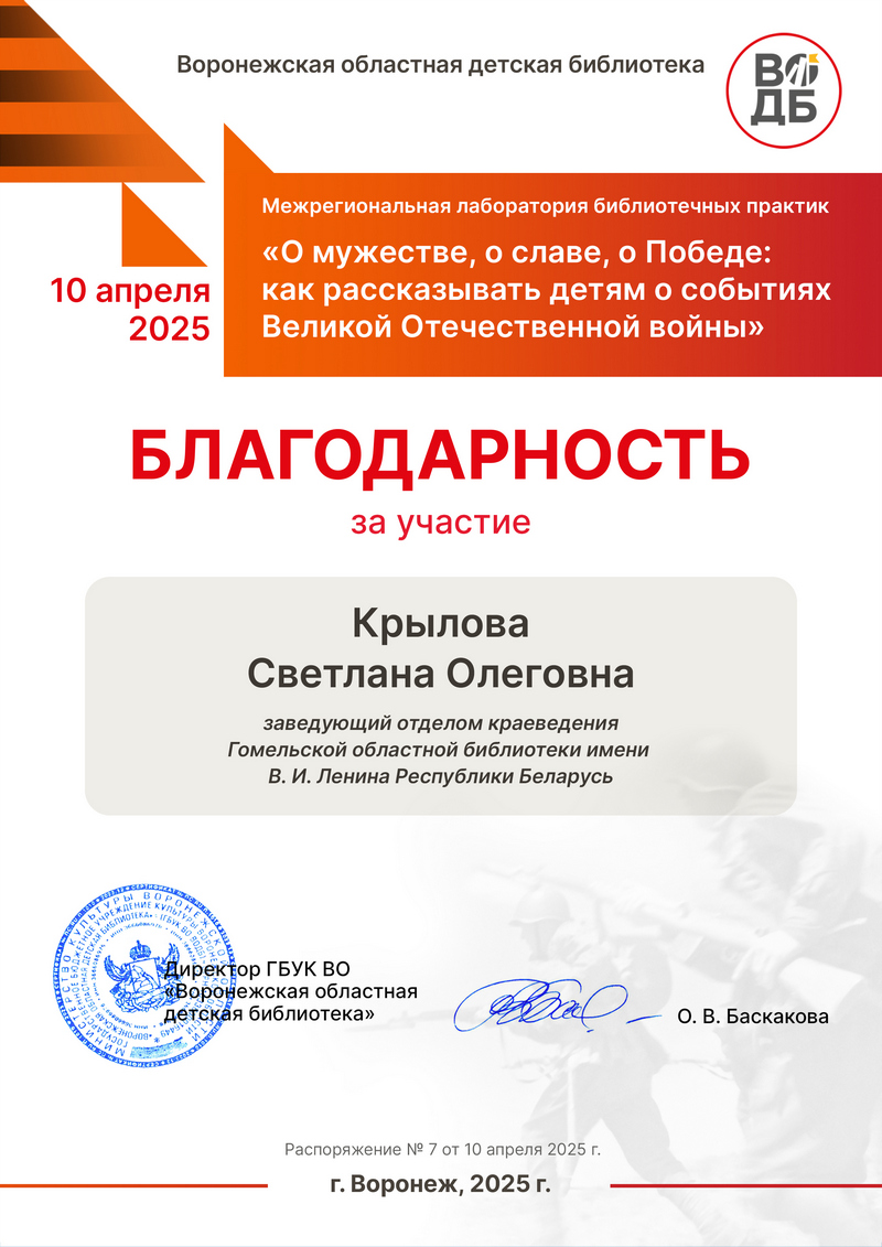 Заведующий отделом краеведения Гомельской областной библиотеки Светлана Крылова 10 апреля с видеодокладом «Музейно-выставочное пространство библиотеки как форма патриотического воспитания» приняла участие в работе Межрегиональной лаборатории библиотечных практик «О мужестве, о славе, о Победе: как рассказывать детям о событиях Великой Отечественной войны». В год 80-летия Победы мероприятие организовала Воронежская областная детская библиотека. Цель встречи – обсудить новые форматы патриотического воспитания подрастающего поколения, поделиться интересными практиками, творческими идеями, успешно реализованными проектами, направленными на формирование у детей и подростков чувства исторической преемственности, уважительного отношения к памяти о Великой Отечественной войне.