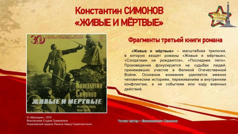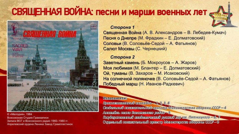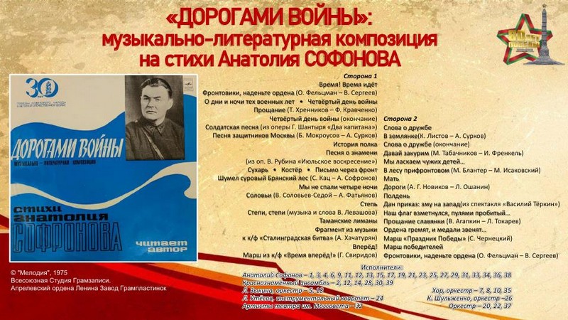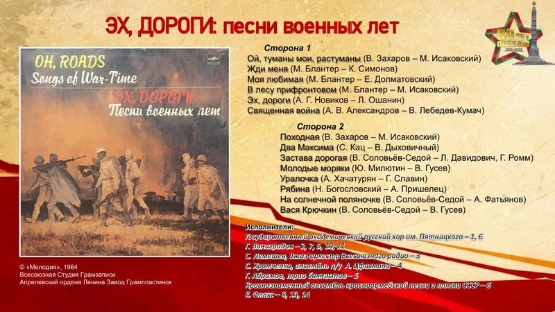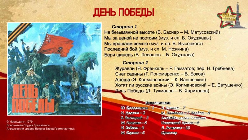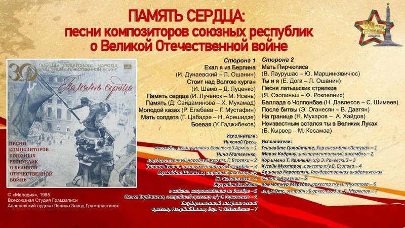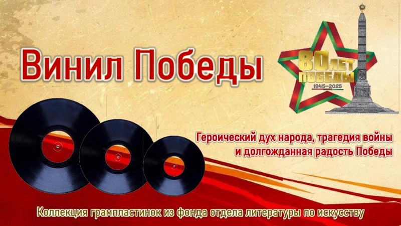 К 80-летию Победы в Великой Отечественной войне отдел литературы по искусству представляет электронную выставку грампластинок «Винил Победы» – уникальную возможность прикоснуться к звуковой летописи эпохи, запечатлённой на виниловых пластинках. Предлагаемая коллекция записей отражает героический дух народа, трагедию войны и, конечно, радость Победы.