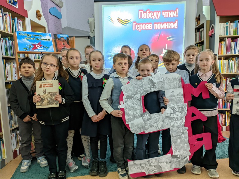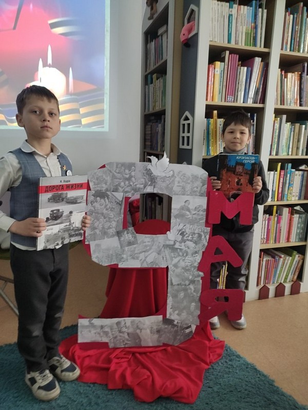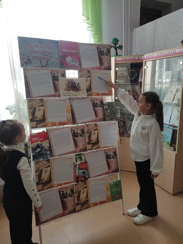 Для юных читателей была подготовлена книжная выставка-экспозиция «Подвигу жить в веках. День Победы!». Ребят заинтересовали книги Н. Ходза «Дорога жизни», С. Алексеева «Великие победы», В. Ляхора «Семь битв 2-й мировой», В. Катаева «Сын полка», Б. Долготовича «Панфиловцы» и другие издания. Большой интерес вызвал выставочный проект о семейных историях войны, где на плакатах были представлены отрывки из работ детей о своих дедушках и прадедушках – участниках Великой Отечественной войны.