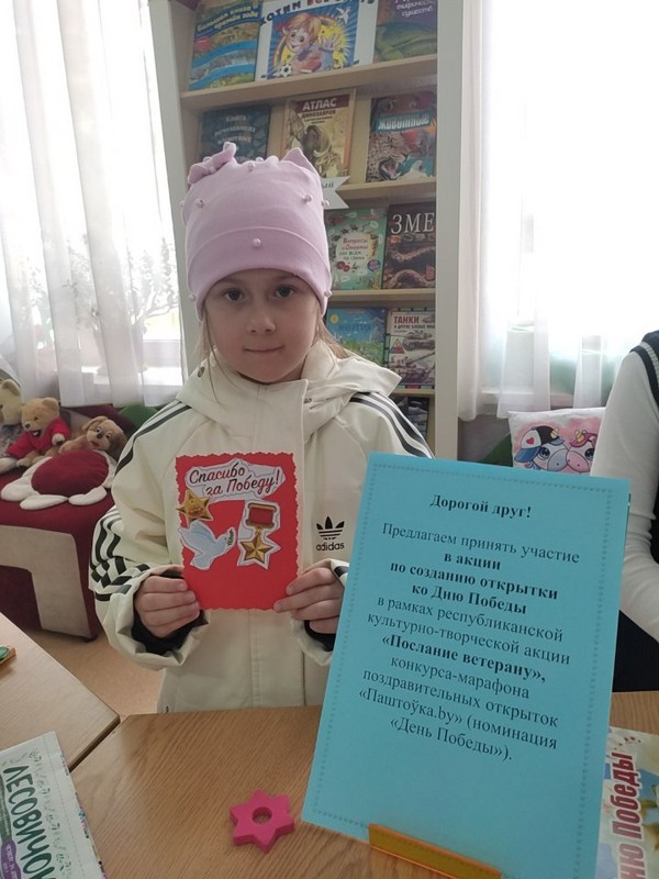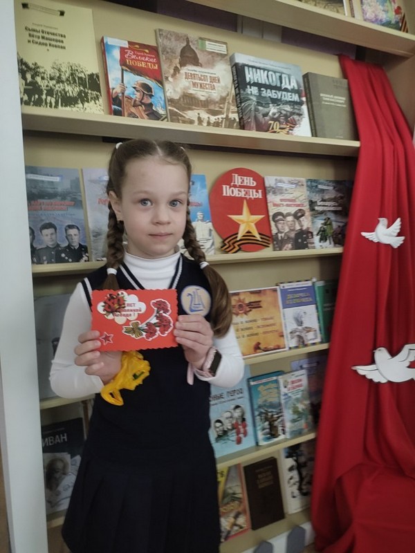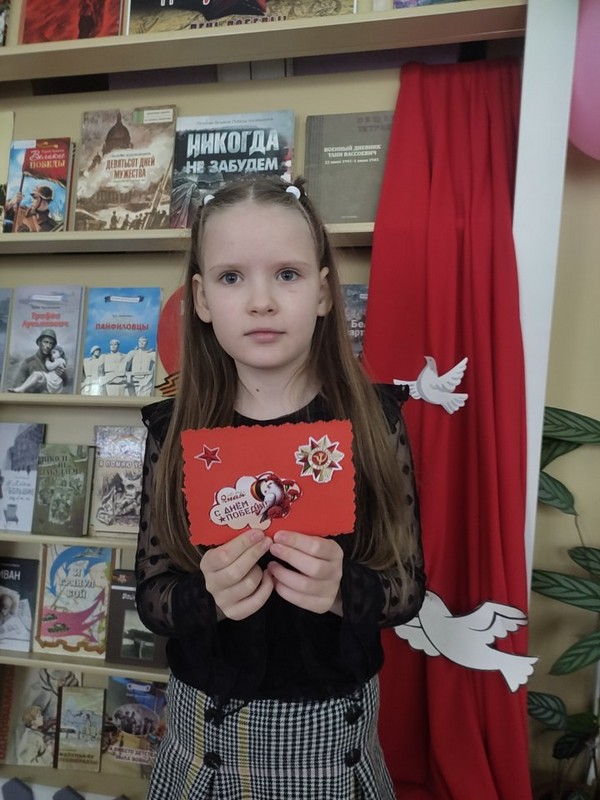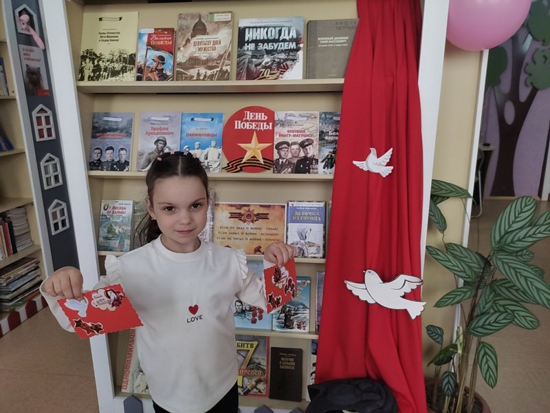 В отделе обслуживания учащихся 1–5 классов завершилась культурно-творческая акция «Послание ветерану». В течение недели, с 7 по 14 мая, юные читатели и их родители могли принять участие в создании открытки и написать тёплые слова для тех, кто не жалел свой жизни во время Великой Отечественной войны. Открытки были сделаны ребятами в том числе и для своих родных, в чьё детство вторглась та страшная война.