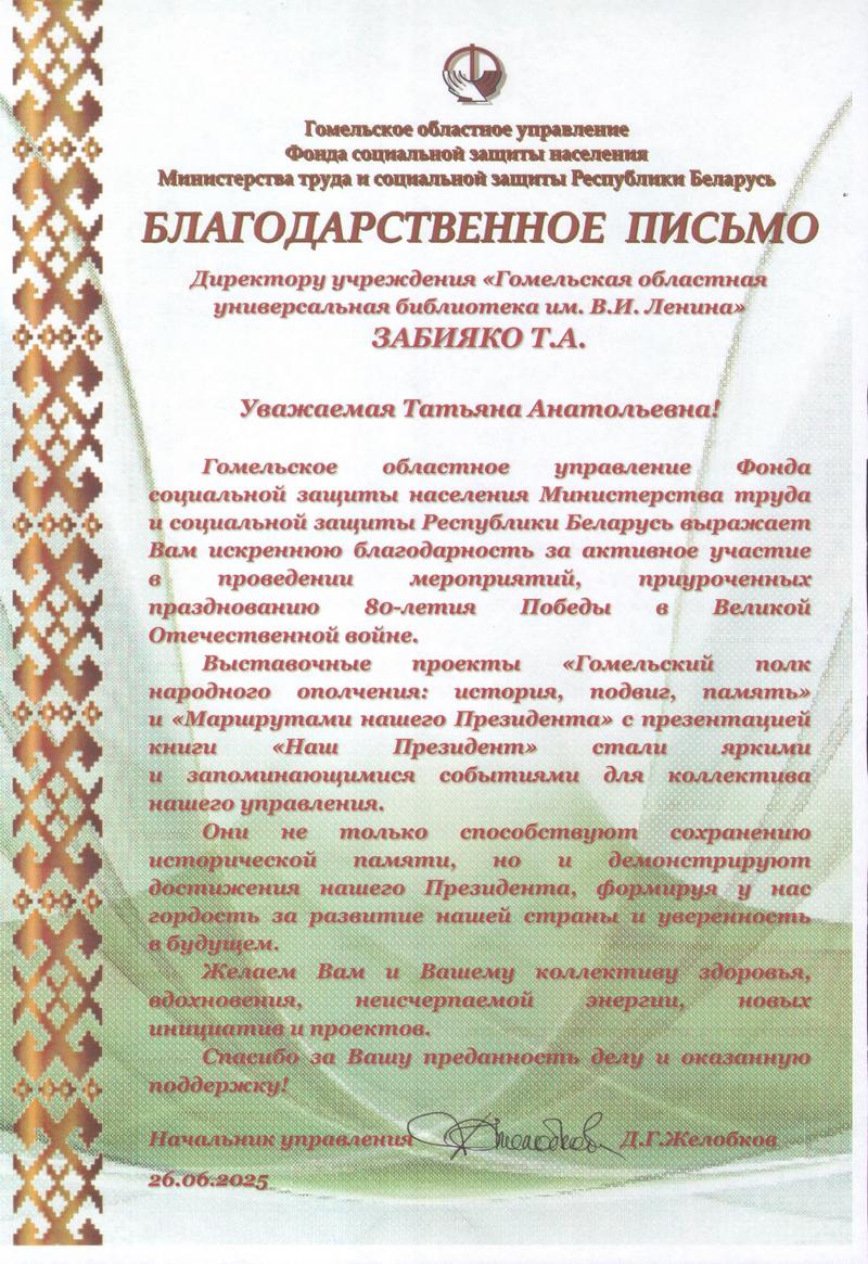 Начальник Гомельского областного управления ФСЗН Дмитрий Желобков вручил БЛАГОДАРСТВЕННОЕ ПИСЬМО, в котором выразил директору Гомельской областной библиотеки Татьяне Забияко слова искренней признательности за активное участие в проведении мероприятий, приуроченных к 80-летию Победы в Великой Отечественной войне.