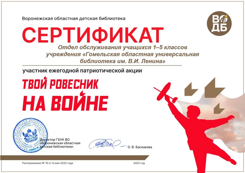 В год 80-летия Великой Победы отдел обслуживания учащихся 1–5 классов Гомельской областной библиотеки принял участие в ежегодной патриотической акции «Твой ровесник на войне», приуроченной ко Дню Победы в Великой Отечественной войне 1941–1945 гг. и направленной на нравственное и гражданско-патриотическое воспитание подрастающего поколения. Основная идея акции, объявленной Воронежской областной детской библиотекой, – чтение книг о Великой Отечественной войне, главными героями которых являются дети и подростки.