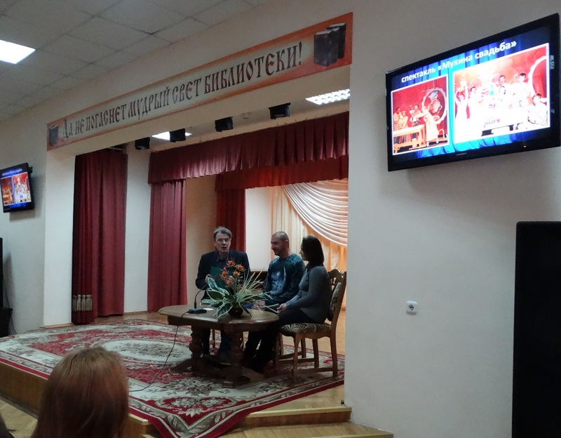 Во время встречи Евгений и Диана отвечали на вопросы ведущего и зрителей (Какие оценки были в школе? Почему Вы стали актером? Какая первая роль была в театре?), потом показали, как работать с куклой. С собой они принесли куклы известных литературных героев – Полиграфа Полиграфовича Шарикова («Собачье сердце») и короля Матиуша I из спектакля «Когда я стану облаком» по книге Я. Корчака.