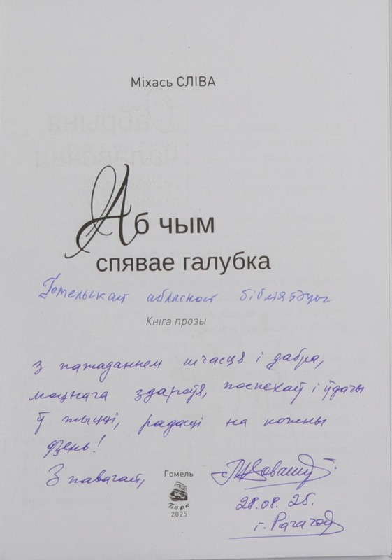 Благодарим Михаила Митрофановича за уникальные материалы и книгу «Аб чым спявае галубка», изданную в 2025 г. в издательстве «Барк». В первую часть новой книги Михася Сливы вошли переводы на белорусский язык рассказов писателей из России, Китая, Франции, Германии, Великобритании, Венгрии, Румынии, Казахстана и других стран. Во второй части размещены юмористические миниатюры известного полесского автора.