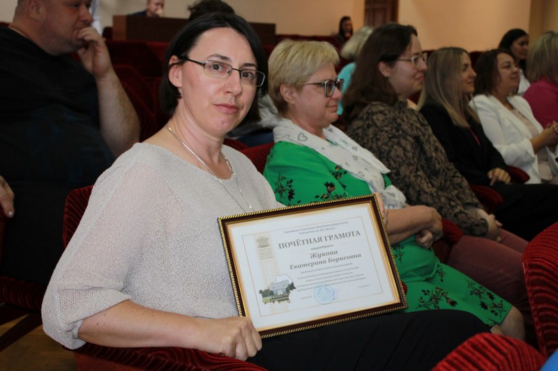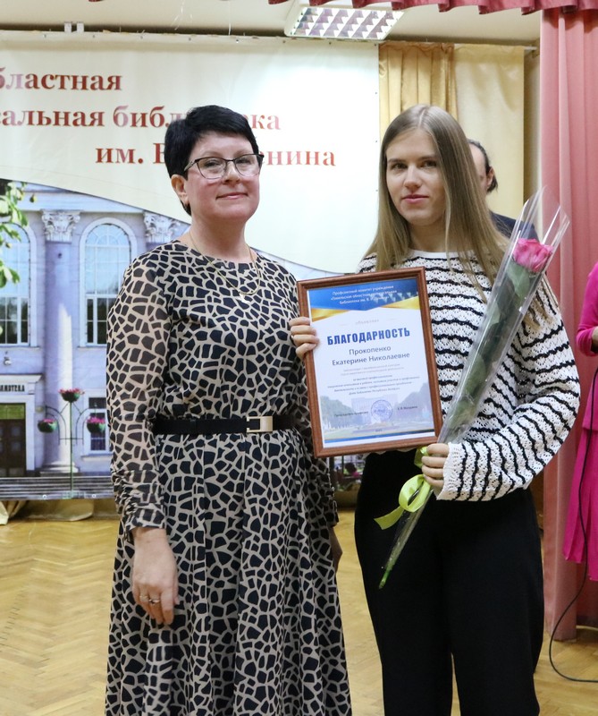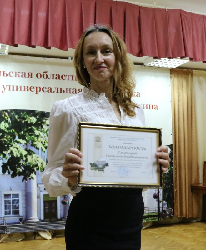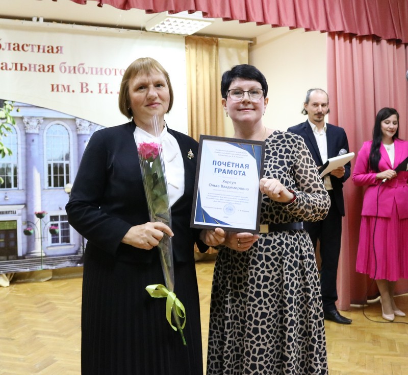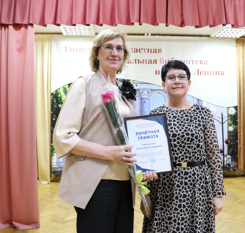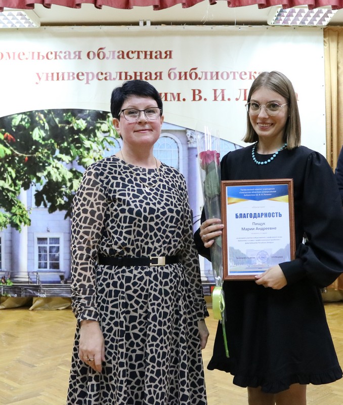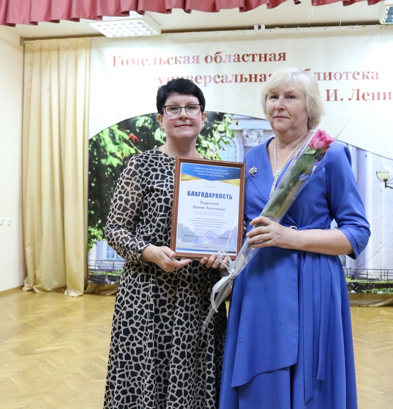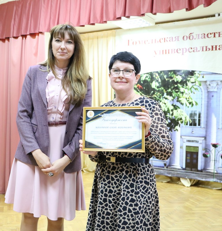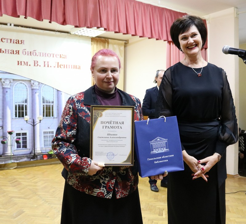 Председатель Совета Гомельского городского отделения Белорусской библиотечной ассоциации Татьяна Барабанщикова в торжественной обстановке вручила ПОЧЁТНУЮ ГРАМОТУ библиотекарю I кв. категории общего читального зала Светлане Шимко за творческий подход к работе.