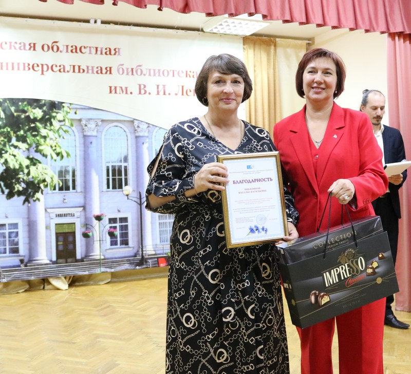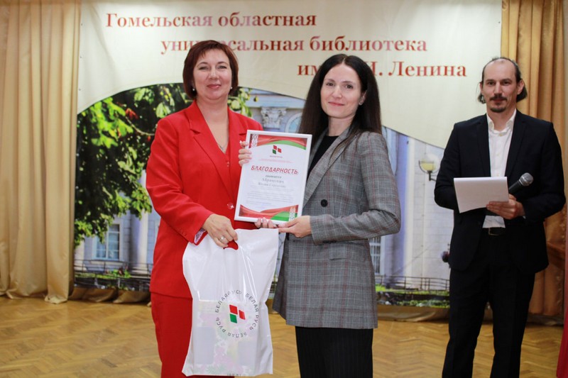 Председатель Железнодорожной районной организации РОО «Белая Русь» Алла Беленок сердечно поздравила с Днём библиотек и объявила БЛАГОДАРНОСТЬ за активную гражданскую позицию заведующему сектором литературы на иностранных языках Юлии Абрамович.
