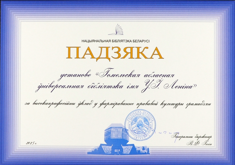 В ходе круглого стола состоялась церемония награждения – Гомельской областной библиотеке объявлена БЛАГОДАРНОСТЬ Национальной библиотеки Беларуси за высокопрофессиональный вклад в формирование правовой культуры граждан.