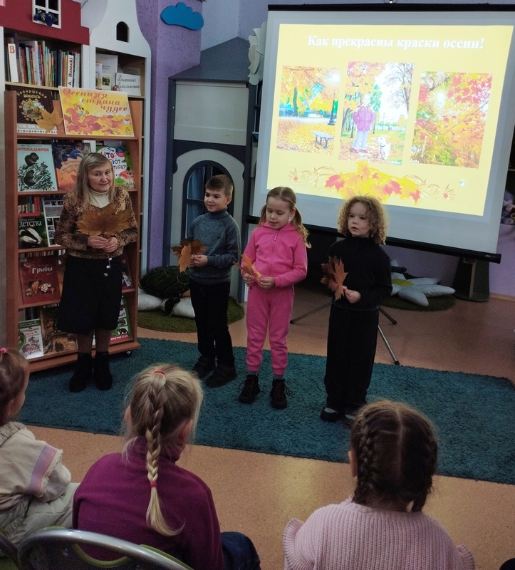 В интерактивной форме дети знакомились с изменениями в природе и приметами осени. Ребята прочитали стихи, составив поэтический портрет поры пышного убранства природы. Во время путешествия ребята с удовольствием отвечали на вопросы о подготовке живой природы к суровому зимнему испытанию, пополняя свой кругозор сведениями из книг В. Бианки, Г. Скребицкого, М. Пришвина, Г. Снегирёва и других писателей-анималистов. Дети активно отгадывали «Загадки с грядки», а затем перевоплотились в овощи и устроили спор: кто из них полезней. С большим интересом они посмотрели осенние мультфильмы «Яблоко» и «Листопадничек».