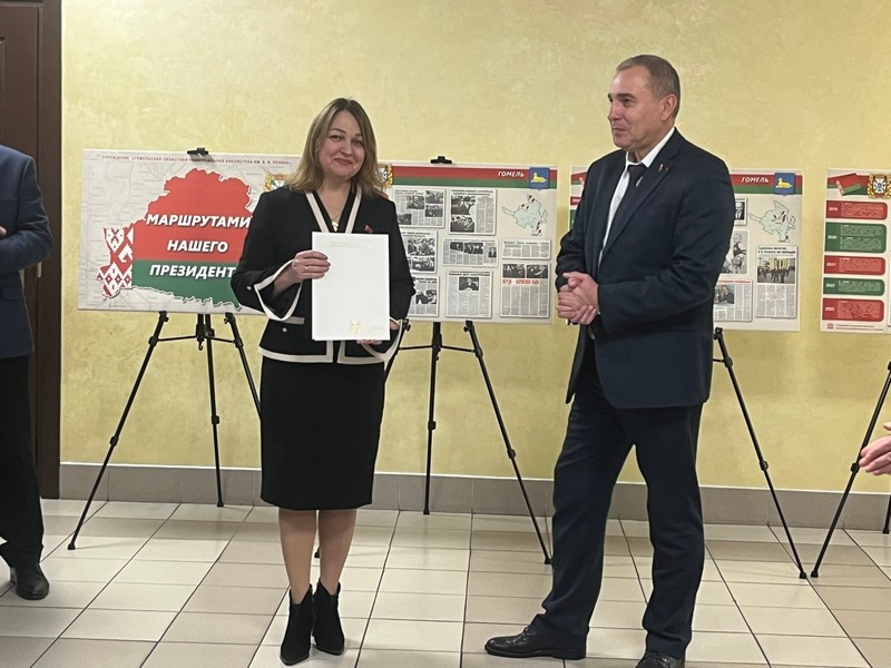 5 ноября в главном управлении юстиции Гомельского облисполкома состоялась презентация выставочного проекта «Маршрутами нашего Президента». Выставка, приуроченная к 30-летию института президентства, в хронологическом порядке демонстрирует рабочие поездки Александра Лукашенко во все районы Гомельщины, опираясь на статьи из периодических изданий из фонда Гомельской областной библиотеки.