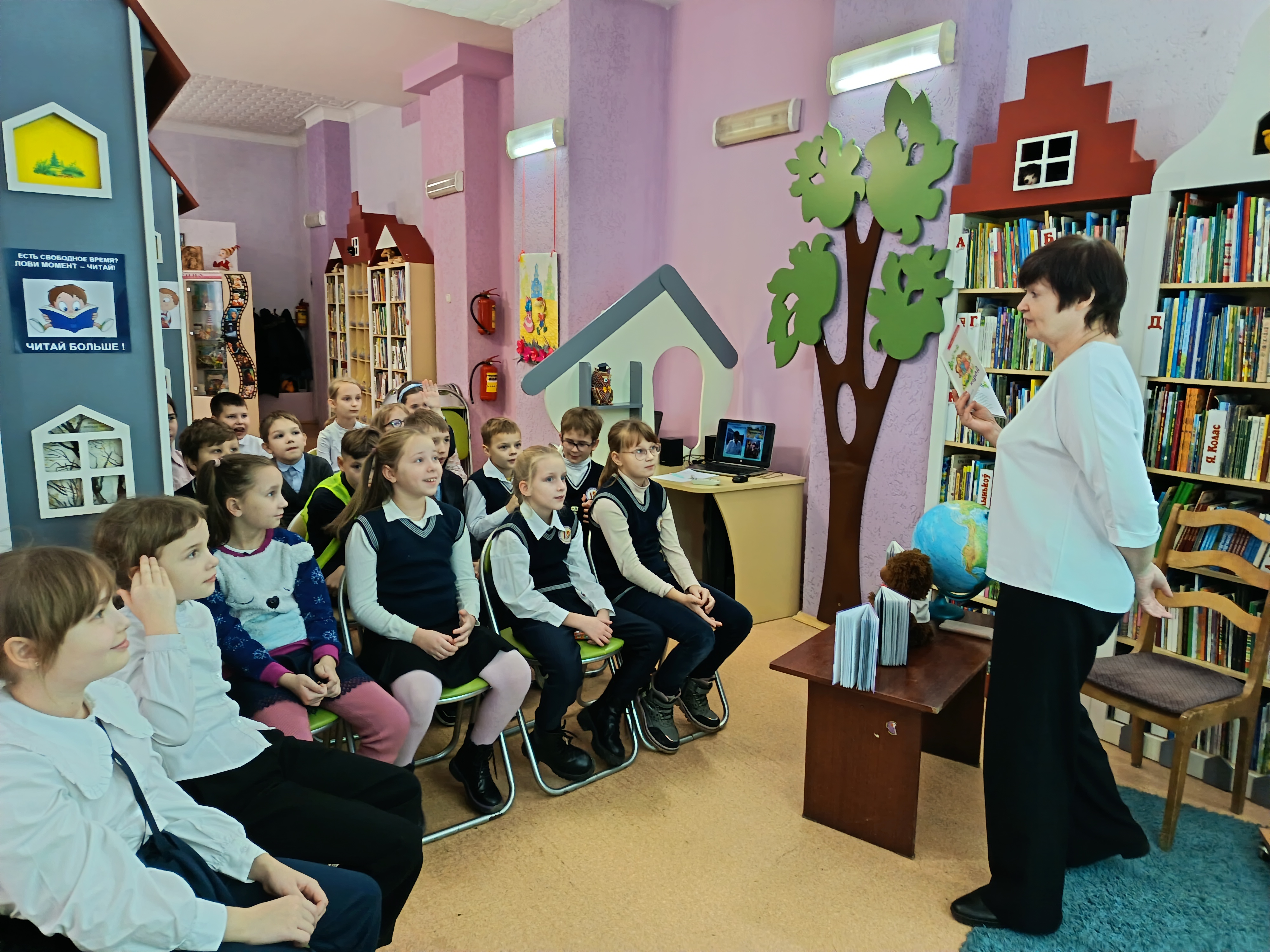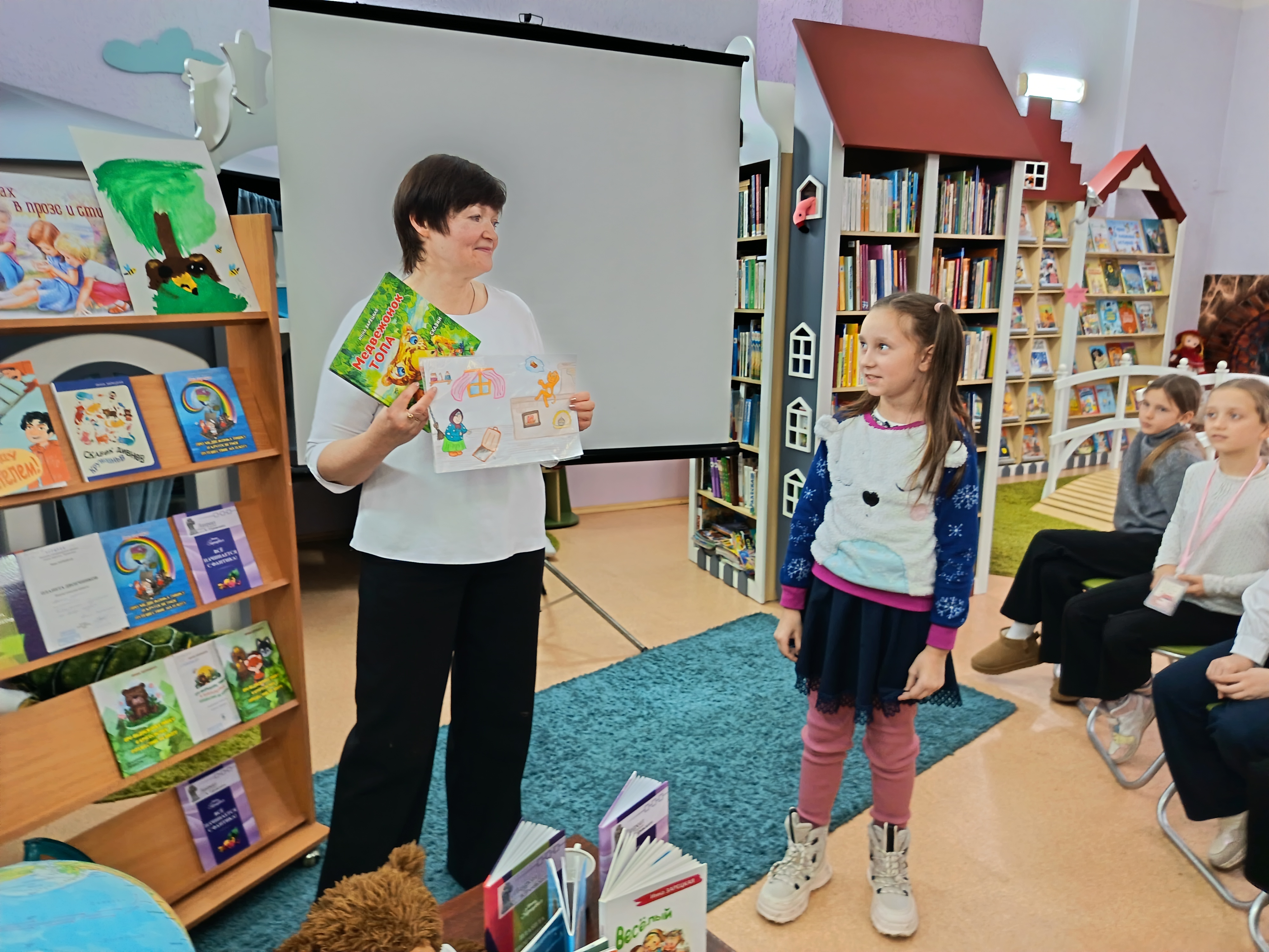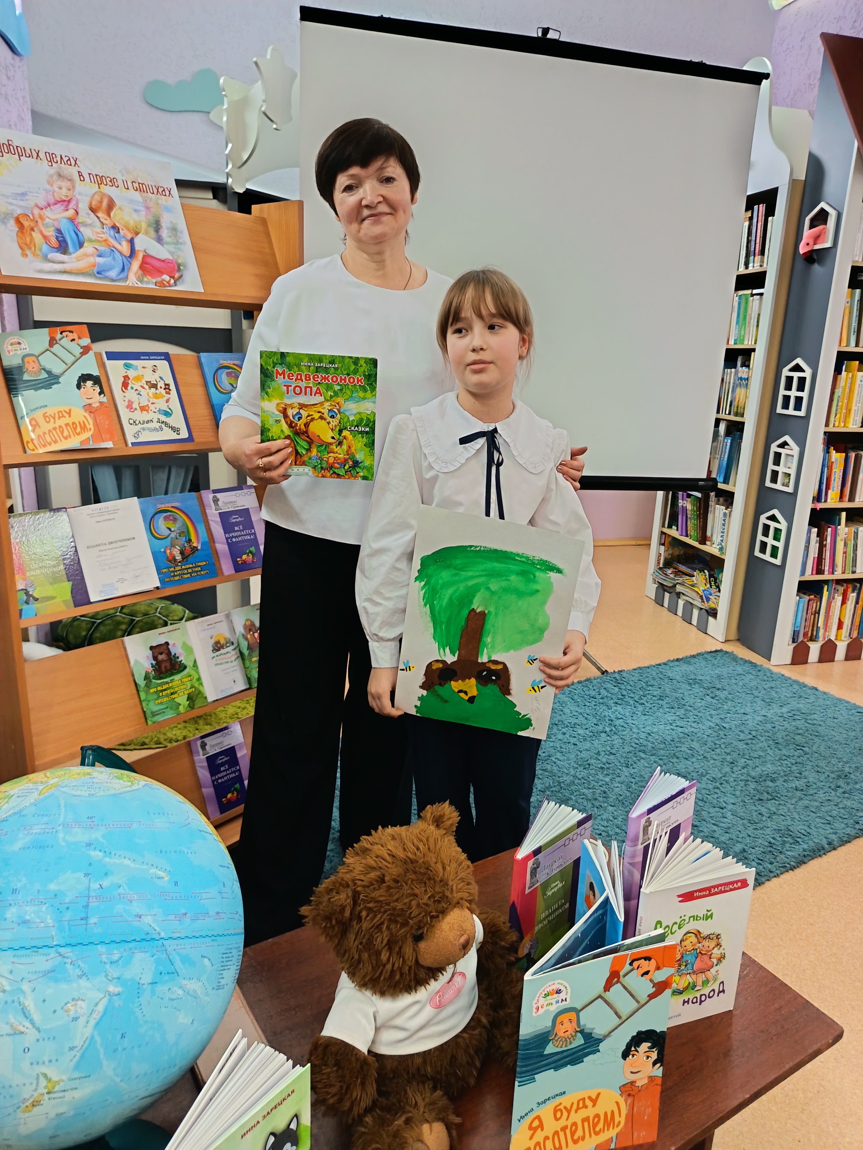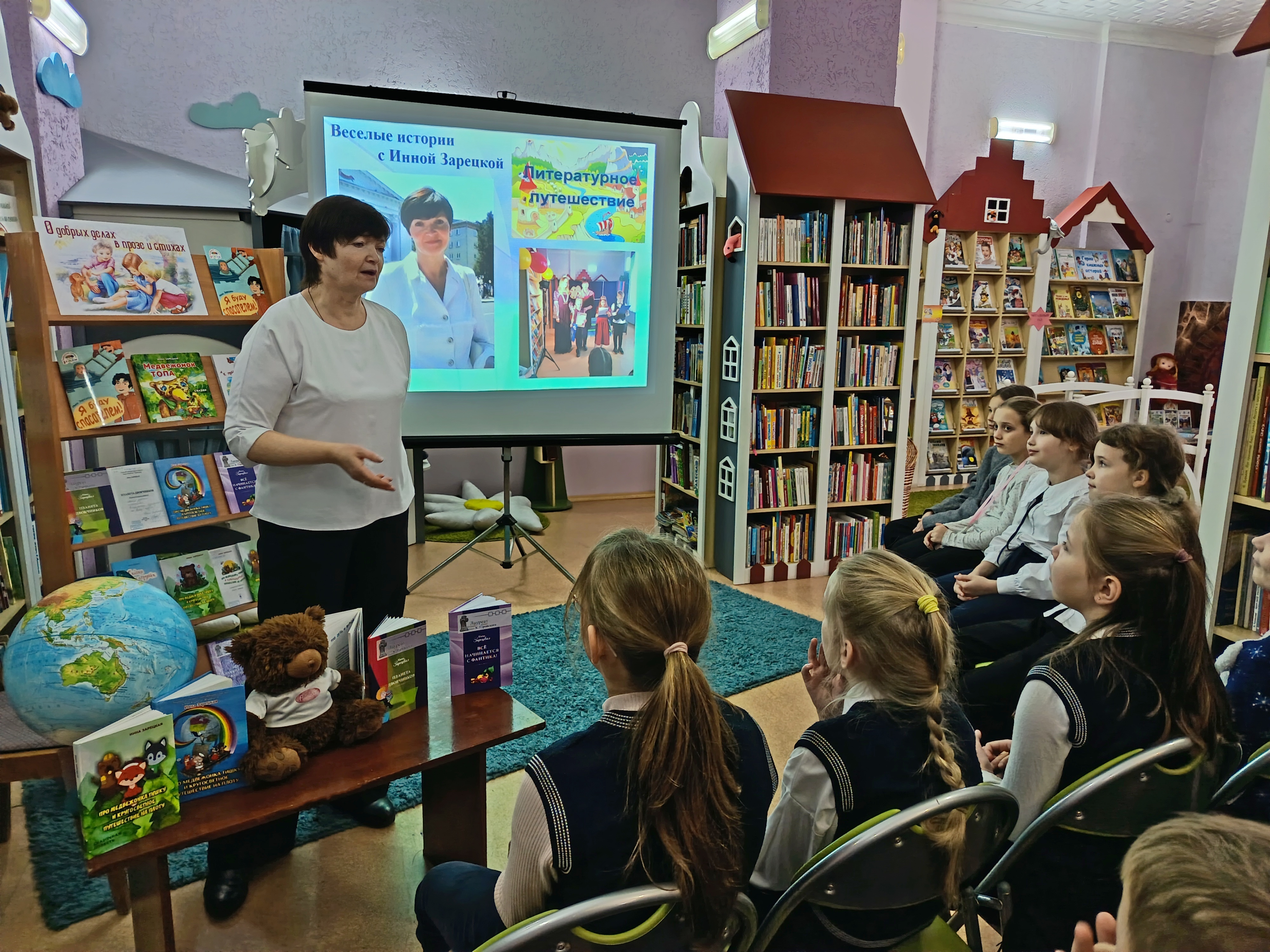 Встреча с полюбившимся автором состоялась в отделе обслуживания учащихся 1–5 классов 21 ноября. Инна Ивановна – автор многочисленных детских книг, трижды лауреат областной литературной премии имени Кирилла Туровского. Она представила ребятам свои книги, рассказала особенности их написания, увлекла детей в мир фантазии, путешествий, рассуждений и весёлых историй. Вместе с автором школьники изучали по глобусу маршрут кругосветного путешествия медвежонка Тишки, говорили о безопасном поведении, читали истории из книги «Я буду спасателем!», смотрели видеосказку «Как медвежонок читать научился». Стихи автора наизусть выучили Михаил Жогло, Мария Андрюк, Роман Ярущенко, Егор Чернюк, Мила Сидоренко, Алиса Синельщикова.