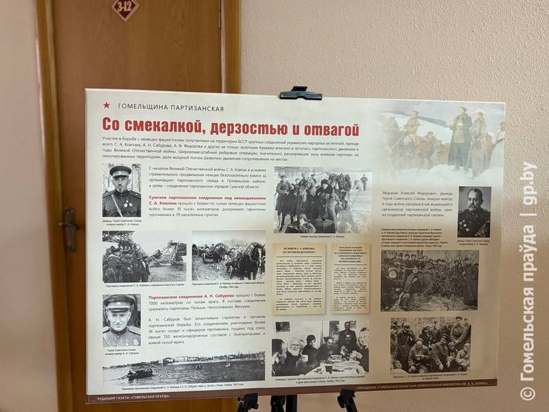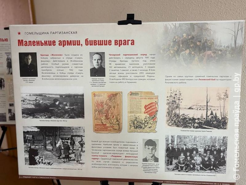 Представленный участникам конференции проект «Гомельщина партизанская» был реализован в областной библиотеке на основе одноимённой книги, изданной в 2025 г. редакцией газеты «Гомельская праўда», с целью увековечения памяти о героях масштабного партизанского движения, развернувшегося на территории Гомельского региона. Экспозиция выставки рассказывает об организаторах и руководителях партизанских отрядов и соединений, сражавшихся с немецко-фашистскими захватчиками, основываясь на уникальных архивных материалах и исторических снимках.