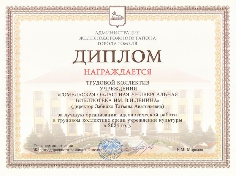 Директору главной библиотеки региона Татьяне Забияко был вручён ДИПЛОМ трудовому коллективу учреждения «Гомельская областная универсальная библиотека им. В.И. Ленина» за лучшую организацию идеологической работы в трудовом коллективе среди учреждений культуры в 2024 году.