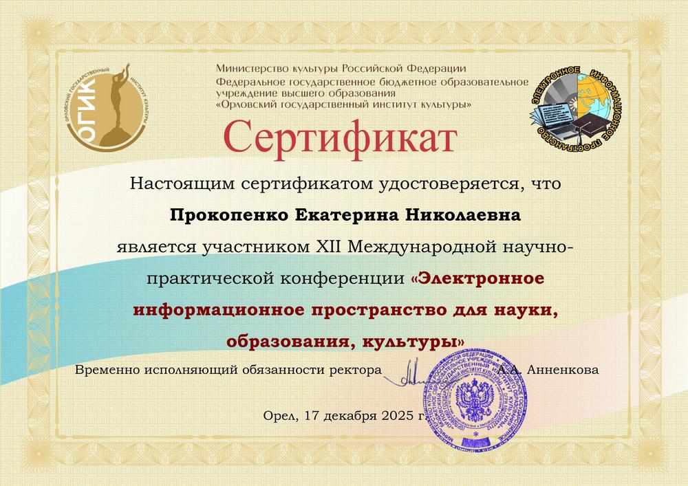 17 декабря библиотекарь отдела маркетинга и социокультурной деятельности Гомельской областной библиотеки Екатерина Прокопенко приняла заочное участие в работе XII Международной научно-практической конференции «Электронное информационное пространство для науки, образования, культуры», организованной Орловским государственным институтом культуры (кафедра библиотечно-информационной деятельности).