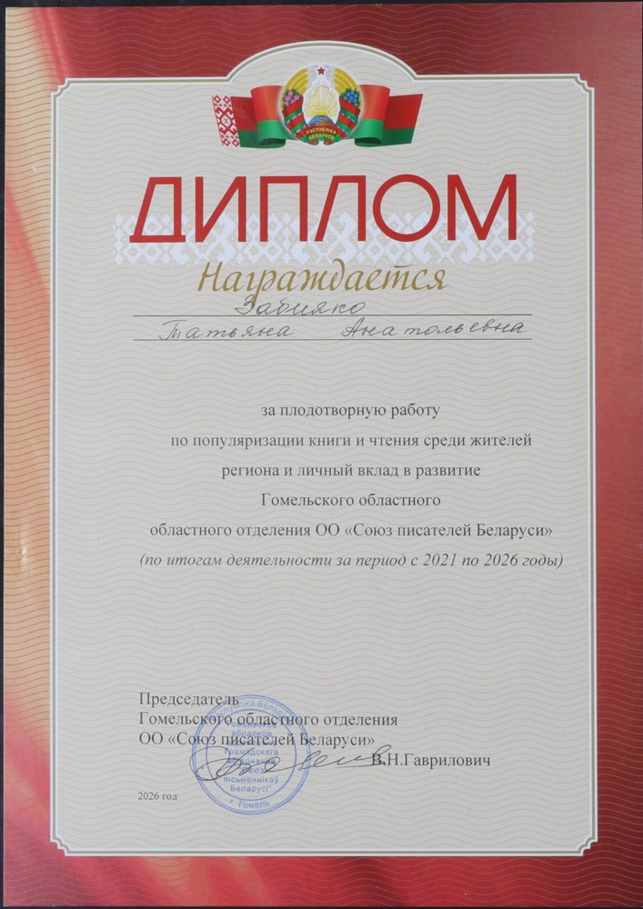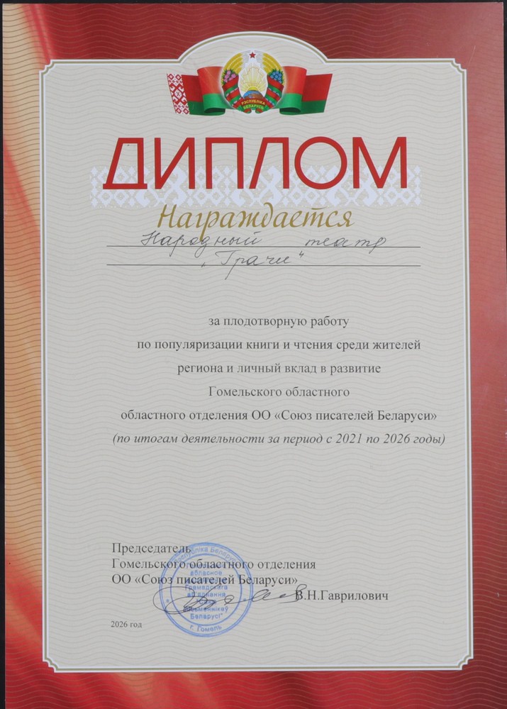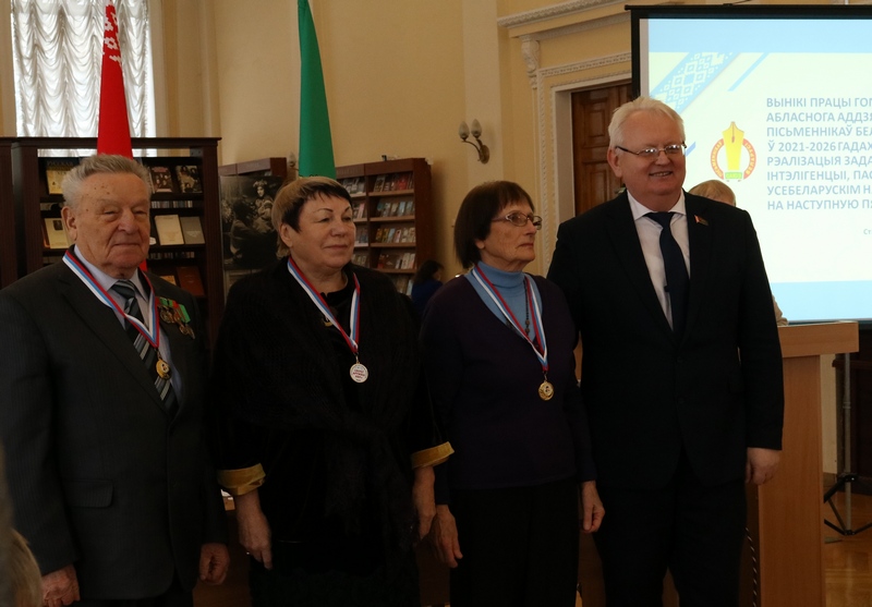 В рамках мероприятия состоялась церемония награждения памятными медалями и дипломами. За плодотворную работу по популяризации книги и чтения среди жителей региона и личный вклад в развитие Гомельского областного отделения Союза писателей Беларуси Владимир Гаврилович вручил ДИПЛОМЫ директору Татьяне Забияко и народному любительскому театру «Грачи» областной библиотеки.