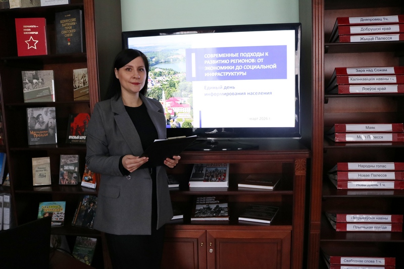 19 марта в Гомельской областной библиотеке прошёл единый день информирования по теме «Современные подходы к развитию регионов: от экономики до социальной инфраструктуры», которую представила заведующий отделом литературы по искусству Ирина Студнева.