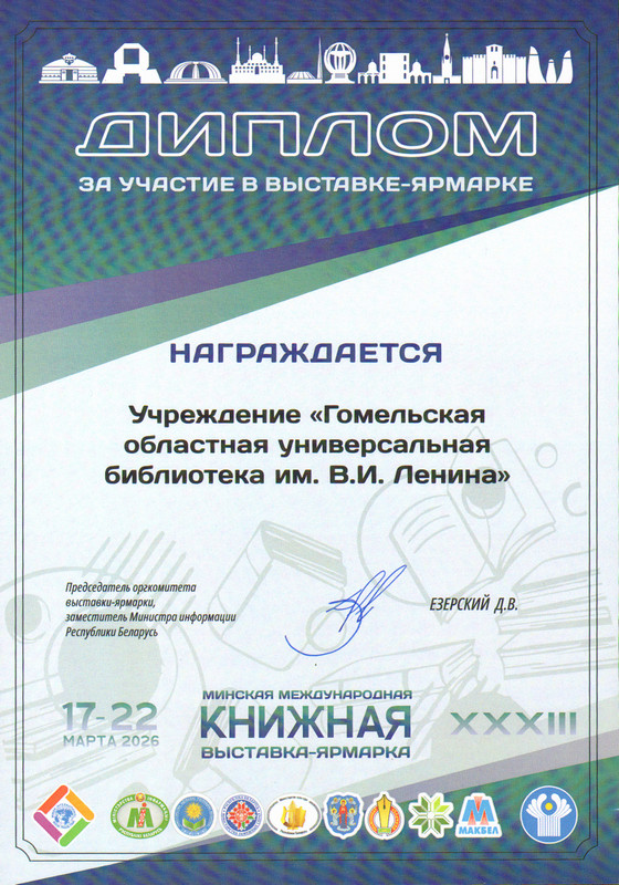 Председатель оргкомитета Минской международной книжной выставки-ярмарки, заместитель Министра информации Республики Беларусь Денис Езерский вручил Гомельской областной библиотеке Диплом за организацию интерактивной площадки для гостей масштабного книжного форума.